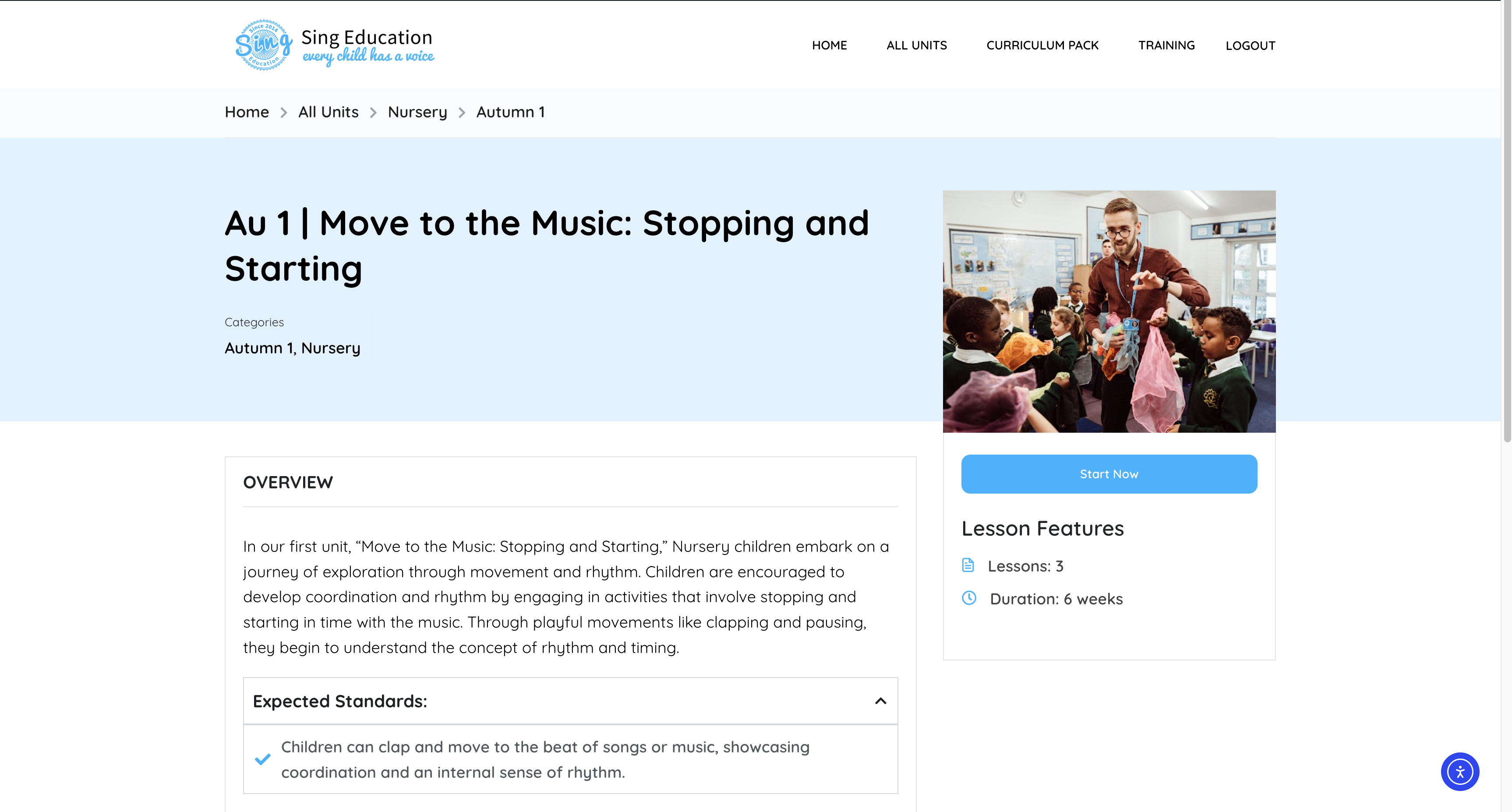 You will now see the course overview page detailing the unit overview and expected student outcomes for the unit. Click the "Teach now" button to open the lesson plans and slides. If you haven't already logged in, you will be prompted to do so here.